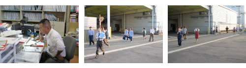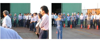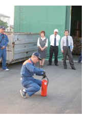 仕事現場からの避難、誘導する際に支障となる問題点の有無を実際の訓練を通じて確認することを目的とした今年の消防訓練。今回は稲沢消防署 東分署の方がお見えになり消火器を実際に使用し、注意点や設置場所の再確認を行いました。