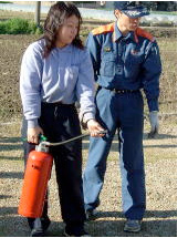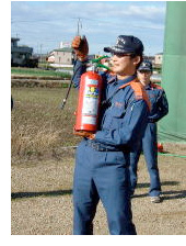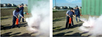 仕事現場からの避難、誘導する際に支障となる問題点の有無を実際の訓練を通じて確認することを目的とした今年の消防訓練。今回は稲沢消防署 東分署の方がお見えになり消火器を実際に使用し、注意点や設置場所の再確認を行いました。